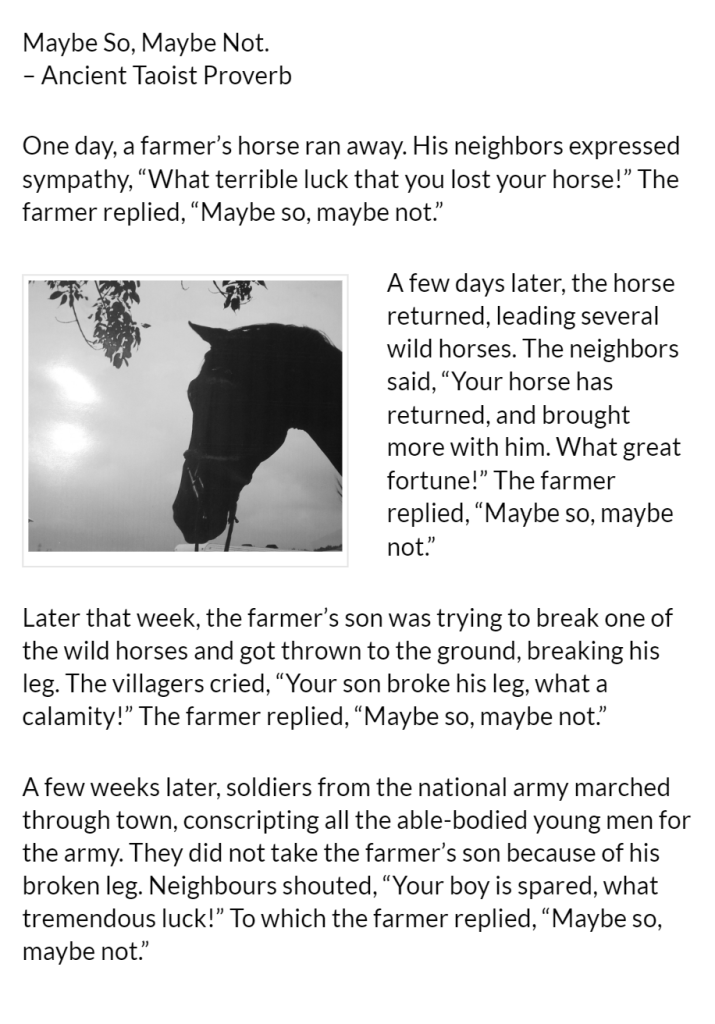 However, while we can feel the sadness of a crushed hope, we don’t have to wallow in our grief. We can know and understand that ultimately God’s plan for our life can come to pass with or without that thing we wished for happening. We should not lose sight of the big picture, knowing that God sees the end from the beginning (Isaiah 46:10), He is ever-present despite the disappointment (Psalm 46) and nothing, absolutely nothing, can separate us from His love (Romans 8:31-39). We may never know what we have been spared by not getting the thing we wished for. There is a parable of a farmer called “Maybe so, maybe not” which illustrates this.